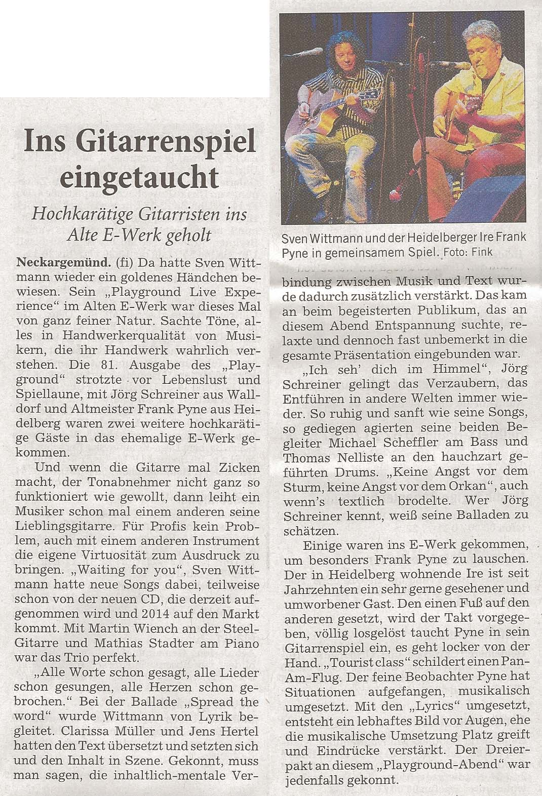 Seit Mai 2005 existiert im Alten E-Werk in Neckargemünd die Konzertreihe The Playground Live Experience und erfreut sich zunehmender Beliebtheit. An jedem 1. Donnerstag im Monat präsentiert Bandleader Sven Wittmann mit seiner Formation Playground ein vielseitiges und anspruchsvolles musikalisches Potpourri, das keine Stilgrenzen kennt.